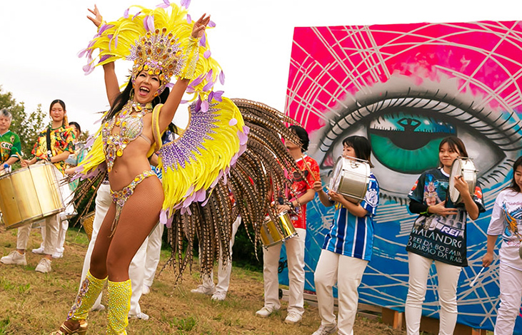 江戸川の河川敷のもつ特徴を活かし、インスタレーション、野外彫刻、外でのライブペイントと呼応するように音楽も流れ、また、食や、リラグゼーションを楽しむことができます。